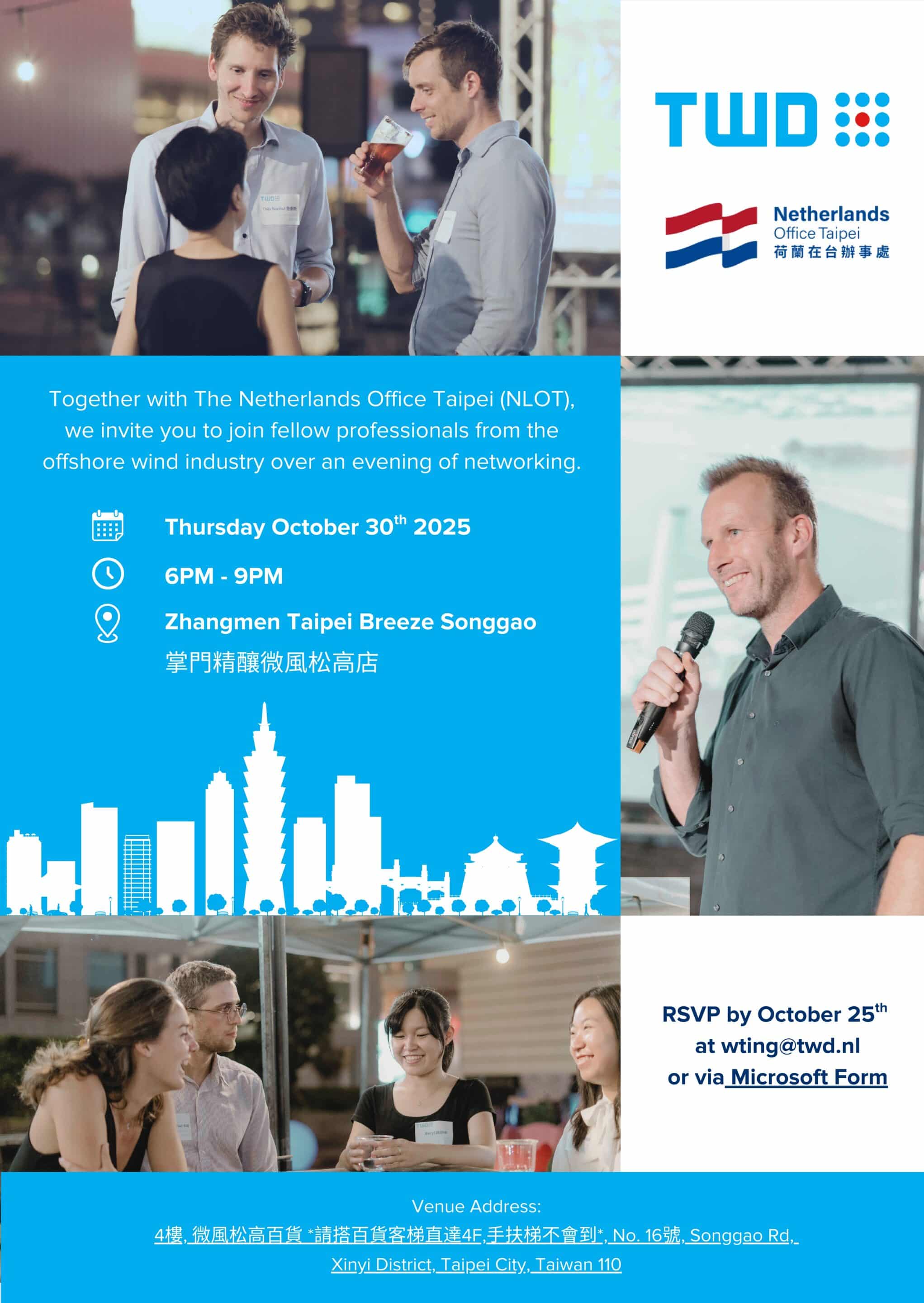 We kindly invite you to attend the Taiwan Offshore Wind Networking Event, to join fellow professionals from the offshore wind industry over an evening of networking, at Thursday October 30, 2025, 18:00 – 21:00. The networking event takes place at Zhangmen Taipei Breeze Songgao in Taipei.